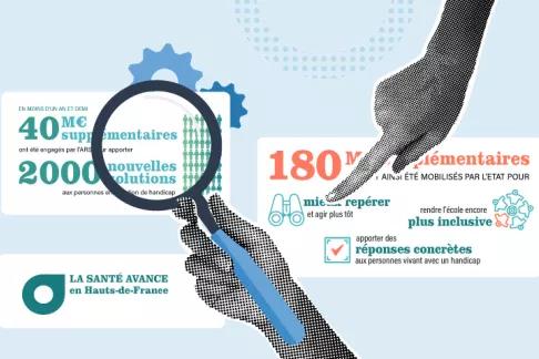 La santé avance en Hauts-de-France ! Dans toute la région, l’ARS accélère le déploiement du plan national 50 000 solutions, qui vise à créer de nouvelles solutions dans les territoires pour accompagner les choix de vie des enfants et des adultes en situation de handicap. Le point en quelques chiffres sur cette dynamique positive.