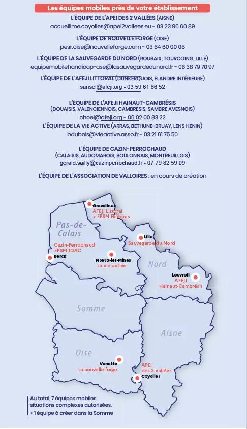 Les équipes mobiles situations complexes accompagnent les enfants et adolescents âgés de 3 à 20 ans en situation de handicap, pris en charge dans des structures sociales et médico-sociales des Hauts-de-France et dont les pathologies et les troubles du comportement et/ou de la personnalité entravent fortement leur intégration dans un groupe. Ces jeunes en difficultés multiples et en souffrance mettent en échec les catégories d’interventions classiques.