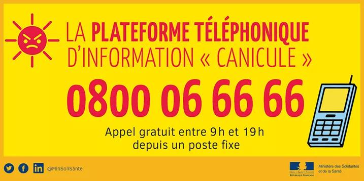 Ce numéro vert permet d’obtenir des conseils pour se protéger et protéger son entourage, en particulier les plus fragiles et pour adopter les bons réflexes face aux fortes chaleurs :