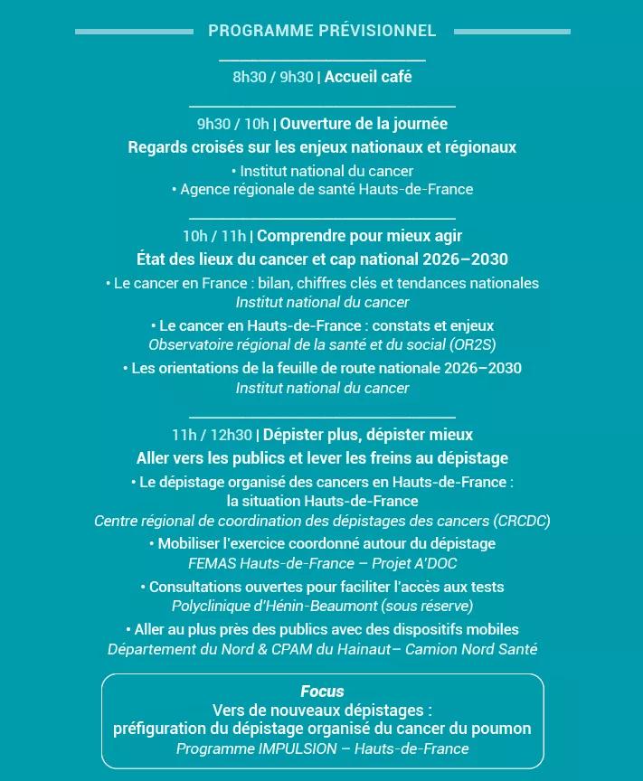 Les Hauts-de-France demeurent l’une des régions les plus exposées au cancer. Depuis 2022, une première feuille de route régionale a permis d’engager des actions structurantes pour prévenir davantage, diagnostiquer plus tôt et mieux accompagner, sur l’ensemble du territoire. Dans le prolongement de de cette première feuille de route, l’Agence régionale de santé Hauts-de-France, en lien avec l’Institut national du cancer, engage aujourd’hui la construction de la stratégie régionale Cancer 2026–2030. Cette journée régionale constitue un temps fort pour partager un bilan collectif, valoriser les dynamiques territoriales et poser les bases des priorités à venir.