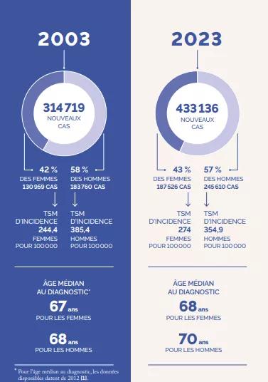 En 2003, 314 719 nouveaux cas de cancer sont diagnostiqués : 42 % chez les femmes (130 959 cas) et 58 % chez les hommes (183 760 cas).
