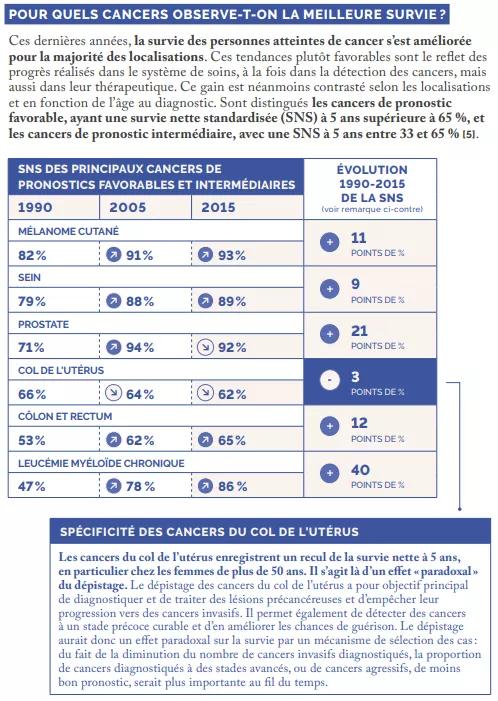 La survie des personnes atteintes de cancer s’améliore globalement depuis 1990. Certains cancers ont un bon pronostic, avec une survie nette standardisée à 5 ans supérieure à 65 %, comme le mélanome de la peau ou le cancer du sein. D’autres présentent une amélioration marquée, comme la leucémie myéloïde chronique, dont la survie est passée de 47 % en 1990 à 86 % en 2015. À l’inverse, la survie du cancer du col de l’utérus diminue légèrement, passant de 66 % en 1990 à 62 % en 2015. Ces évolutions s’expliquent notamment par les progrès du dépistage et des traitements, mais restent variables selon les cancers et les âges.