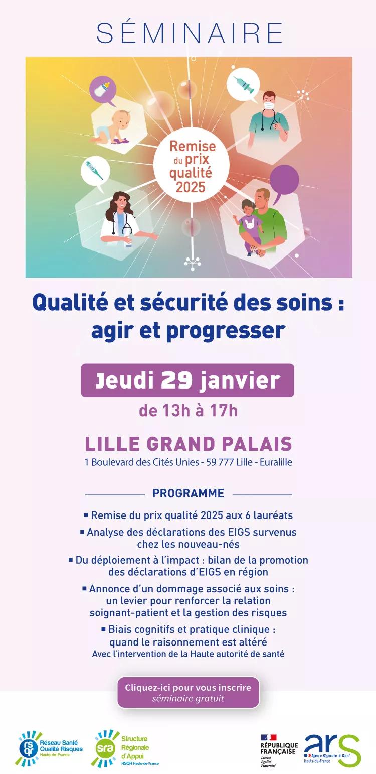 Initié en 2019, ce prix qualité vise à valoriser l’engagement de professionnels de santé des établissements sanitaires, des établissements médico-sociaux, des organisations coordonnées en ville , du monde associatif et des collectivités territoriales, en particulier les équipes porteuses de dispositifs de prévention des Hauts de France dans la mise en œuvre de démarches innovantes sur le sujet de la qualité et de la sécurité des soins.