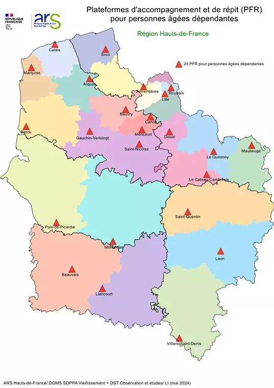 L’image est une carte géographique représentant la région Hauts-de-France. Elle montre l’implantation des plateformes d’accompagnement et de répit pour personnes âgées en 2024.