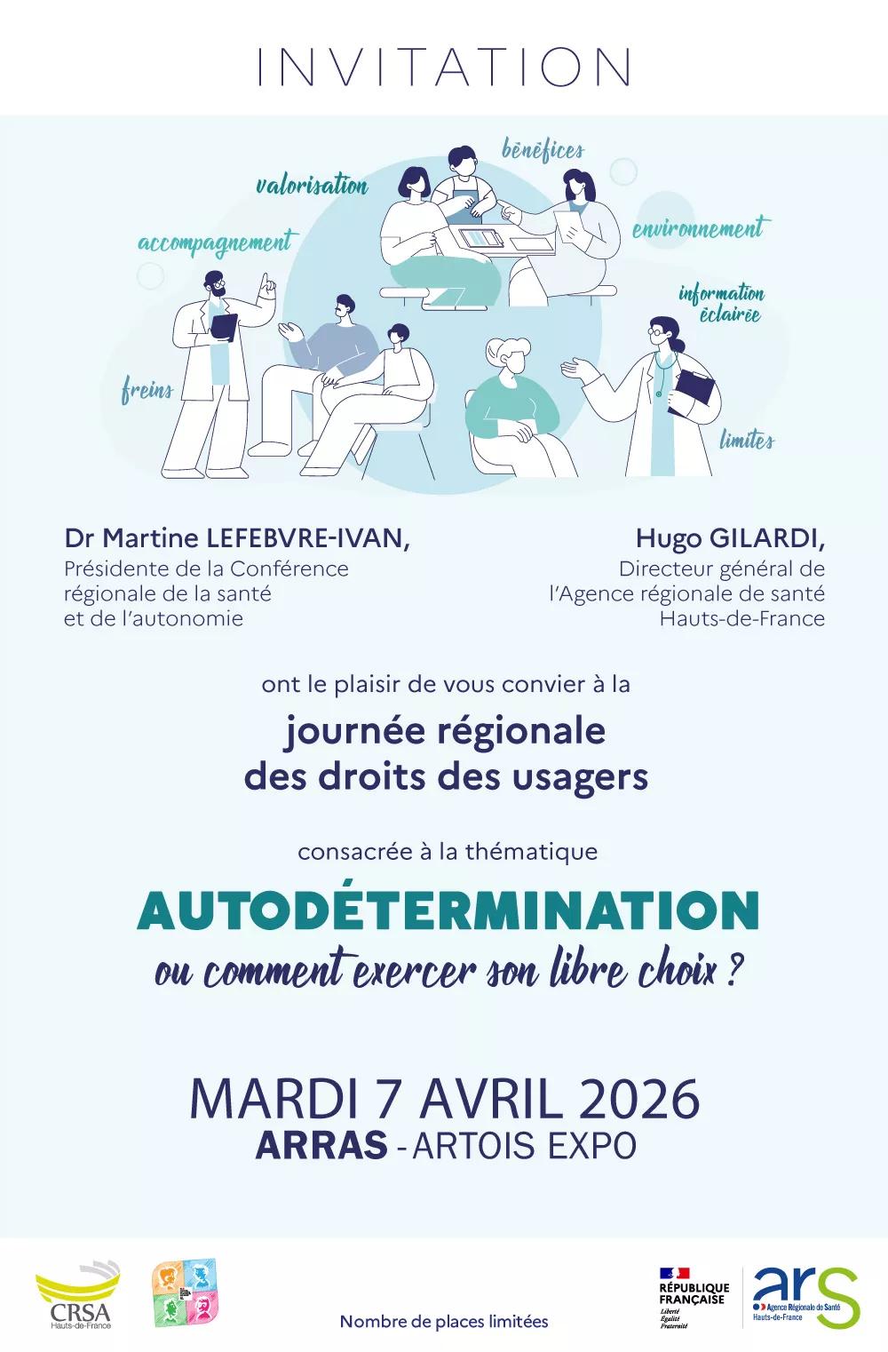 Affiche d’invitation à la Journée régionale des droits des usagers, organisée par la Conférence régionale de la santé et de l’autonomie( Dr Martine Lefebvre-Ivan, présidente) et l’Agence régionale de santé Hauts-de-France (Hugo Gilardi, directeur général).