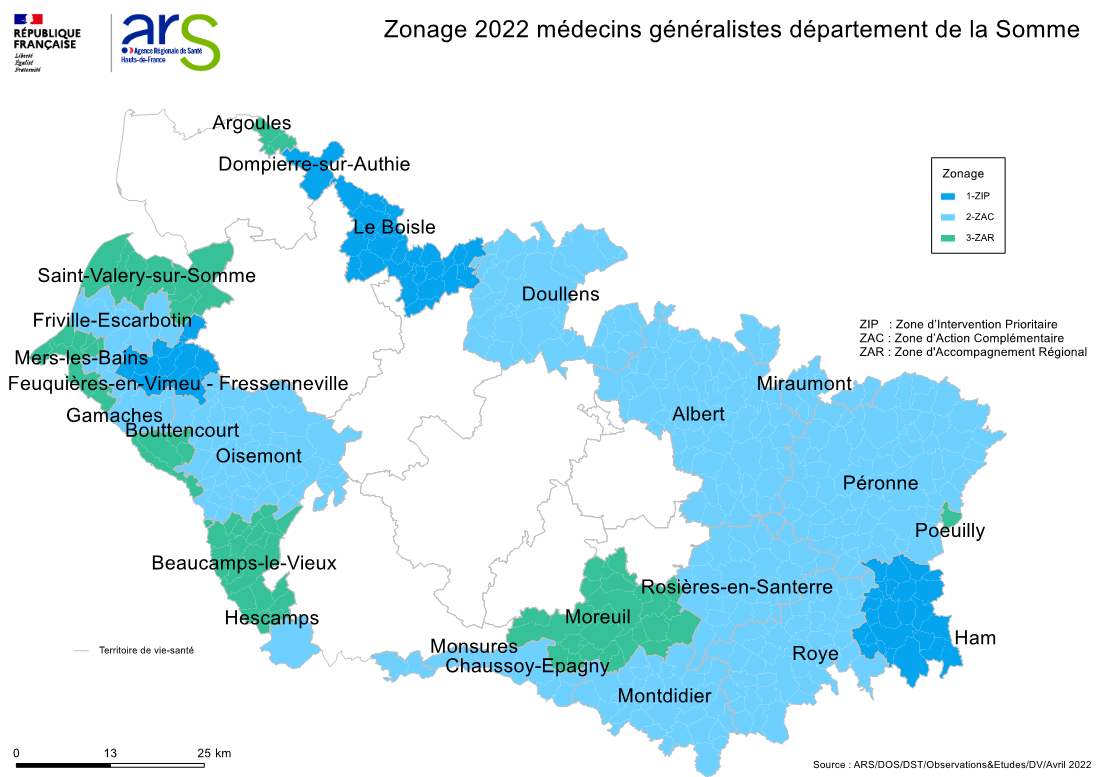 On retrouve dans ce zonage les deux types de zones prévues au niveau national : les Zones d’intervention prioritaire (ZIP) et les Zones d’actions complémentaires (ZAC), ainsi qu’une catégorie supplémentaire de zone créée spécifiquement par l’ARS HDF : les Zones d’accompagnement régional (ZAR). Cette initiative de l’ARS HDF, prise dès 2020 dans le cadre du précédent zonage, permet d’augmenter le nombre de territoires éligibles aux aides et d’inclure des communes qui connaissent un niveau de difficultés moindre mais bien réel en matière d’accès aux soins. Cette catégorie supplémentaire de zone permet aussi d’y intégrer certains territoires qui sont à proximité immédiate de ZIP ou de ZAC mais qui pour autant n’étaient pas éligibles à l’une ou l’autre, afin d’éviter de trop grands écarts en matière d’aides à l’installation à quelques kilomètres près. Ainsi, en Hauts-de-France, un médecin généraliste s’installant dans une zone identifiée sous-dense, ZIP, ZAC ou ZAR, bénéficiera d’une aide à l’installation. Dans les ZAC et les ZAR, ces aides sont intégralement financées par l’ARS HDF.